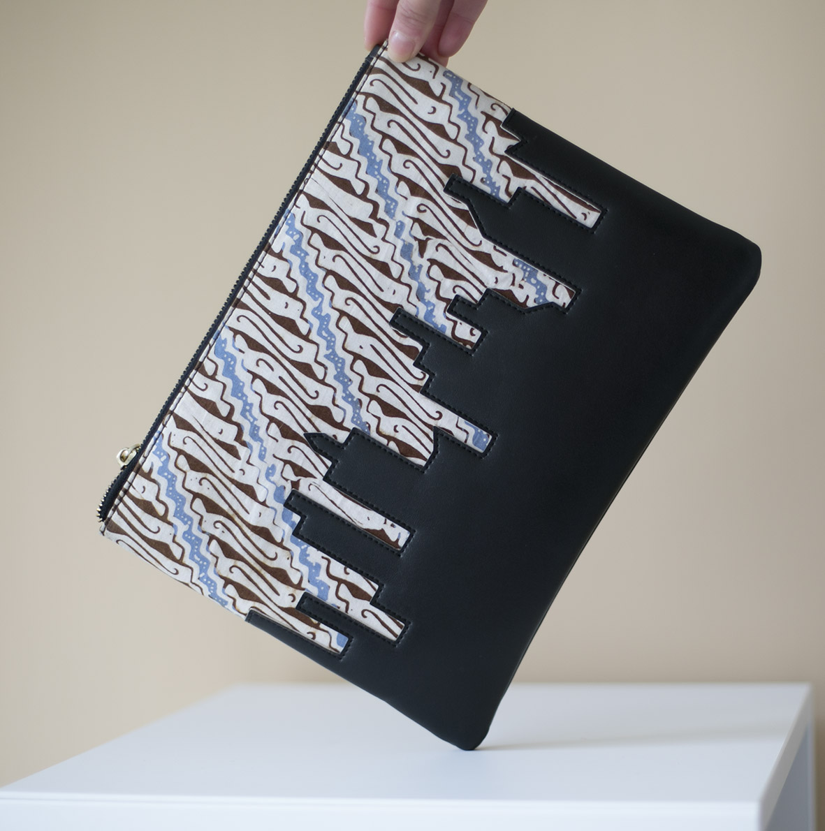 A backdrop of batik against black leather cut to resemble the city skyline. A unique batik clutch that will make heads turned!