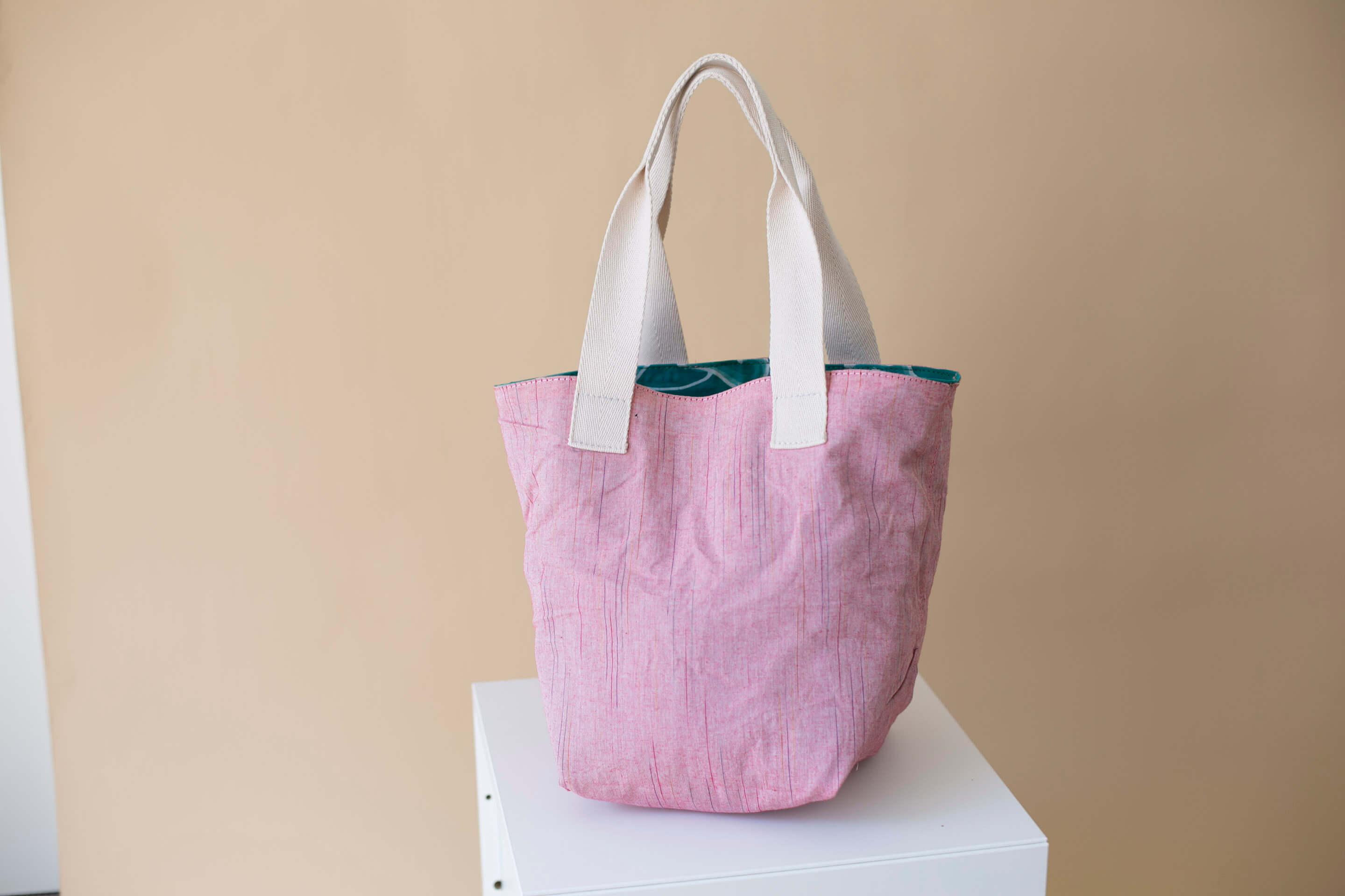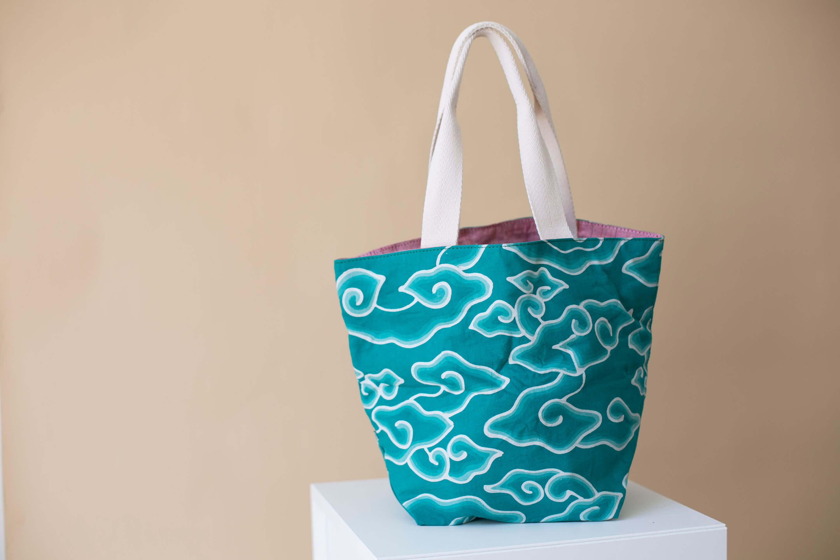 This particular Batik carries a pattern of 'mega mendung' which means cloudy cloud as depicted. It symbolizes calmness and quietude of life. The tote also comes with pink lurik interspersed with broken red stripes to denote 'udan lidris' (means drizzling rain) pattern.
