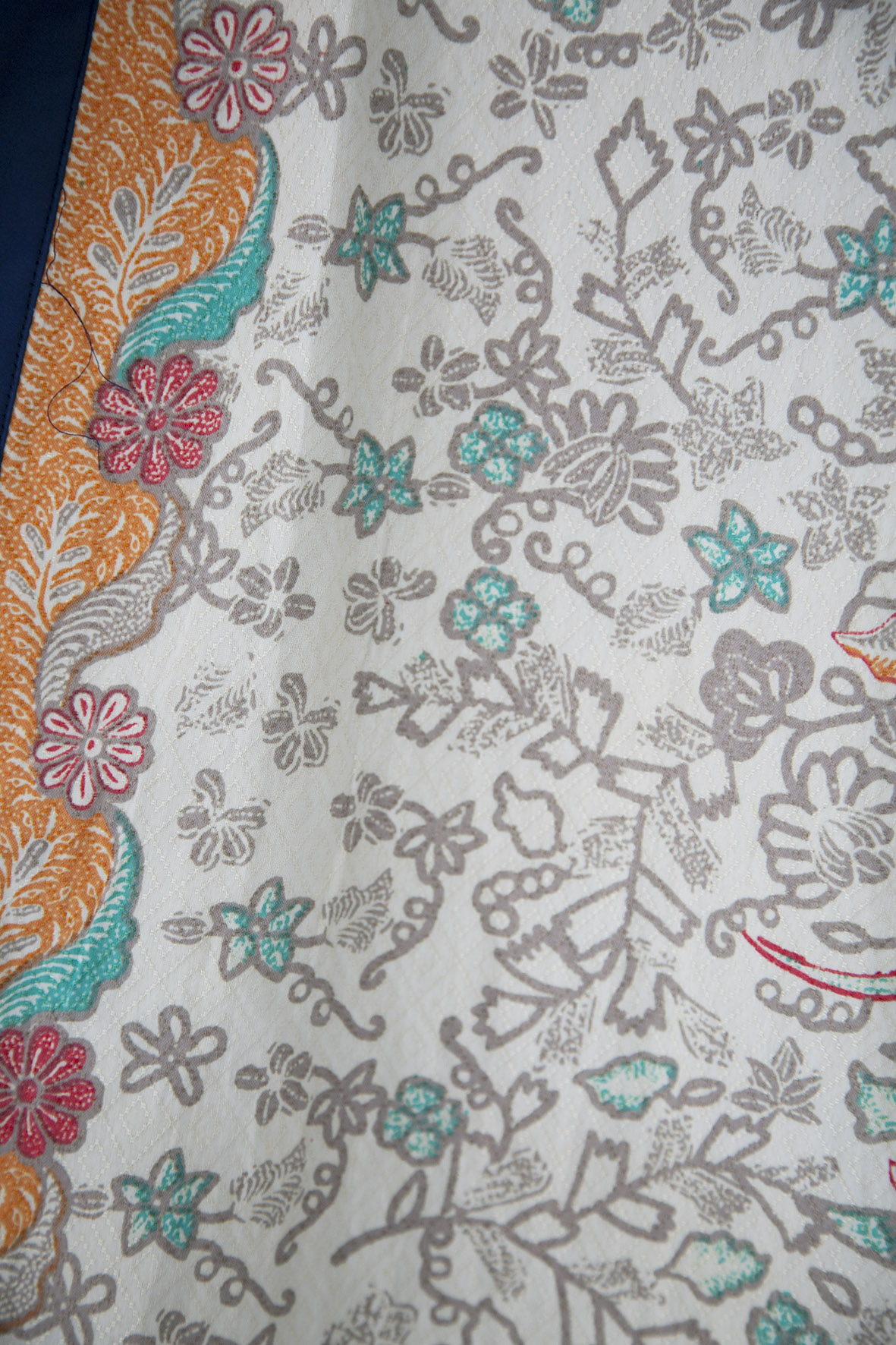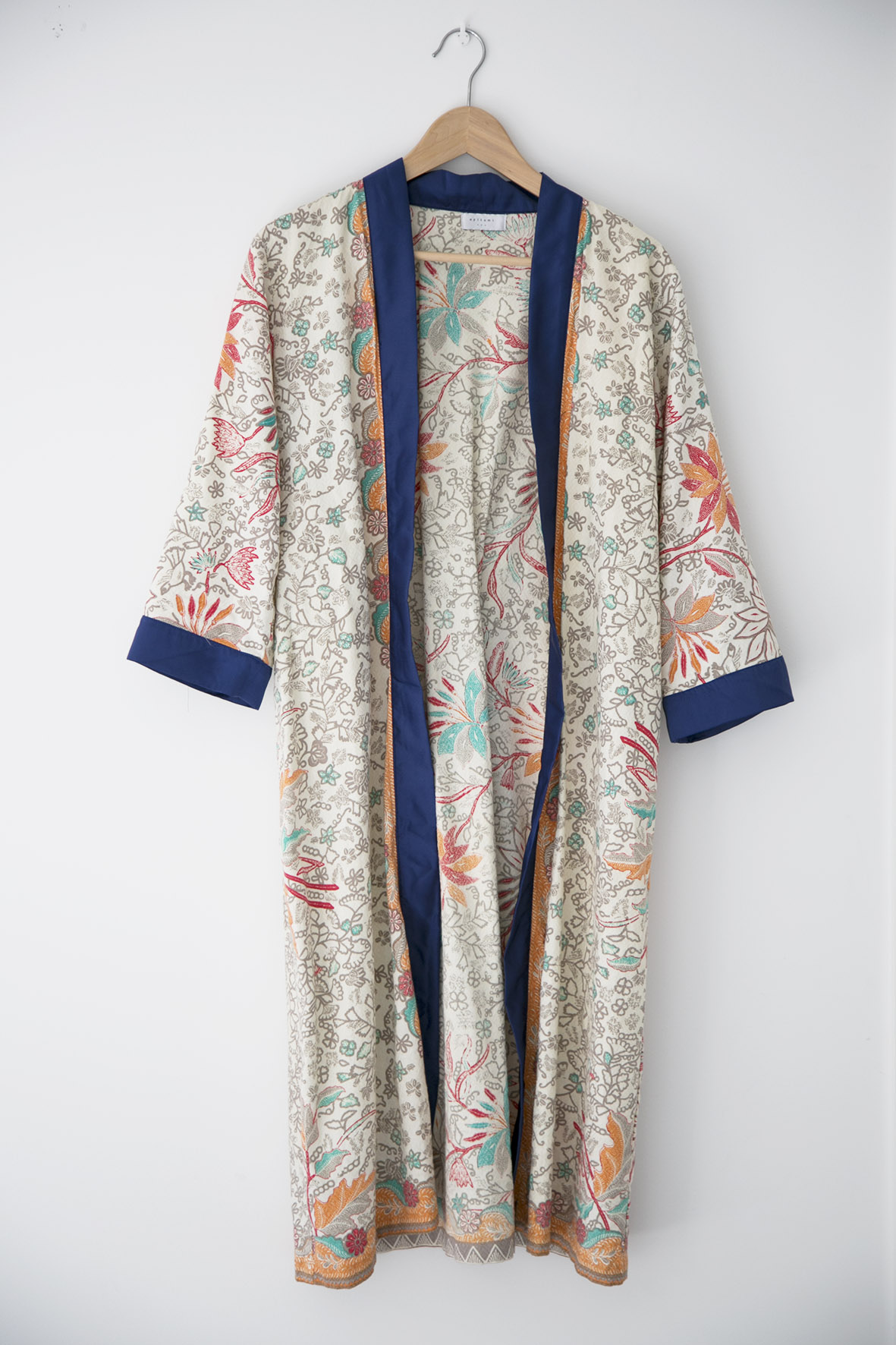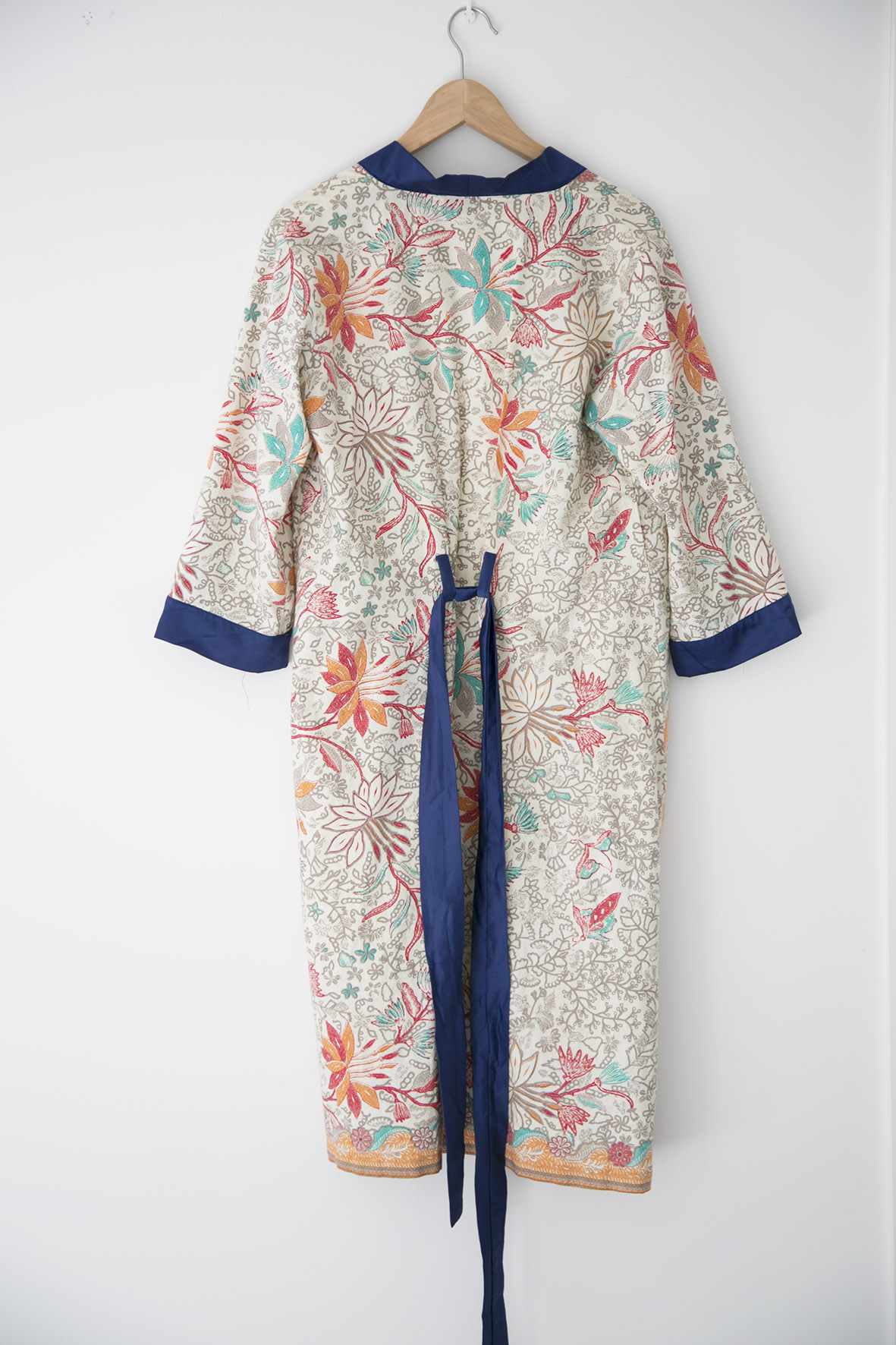 Lightweight and breezy batik outerwear. The fabric is hand painted with wax and dyed with colours to achieve the blossoming colourway!