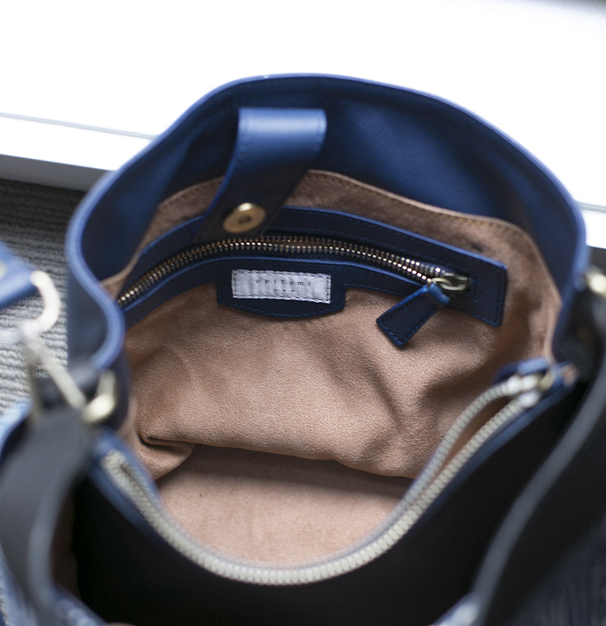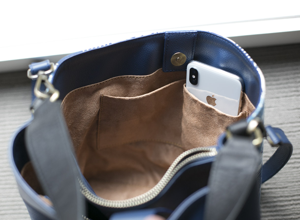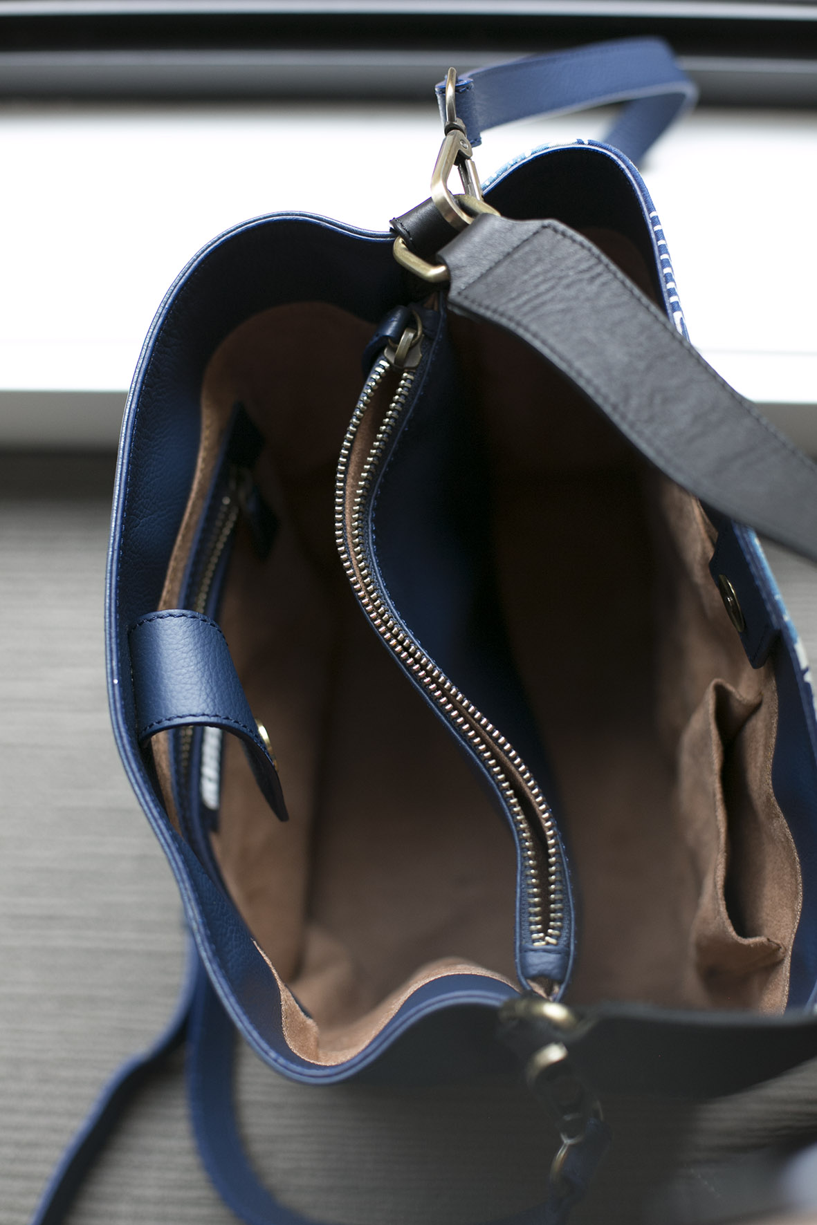 Comes with zipped middle divider, a contrasting black leather short strap and longer blue adjustable strap for your convenience!