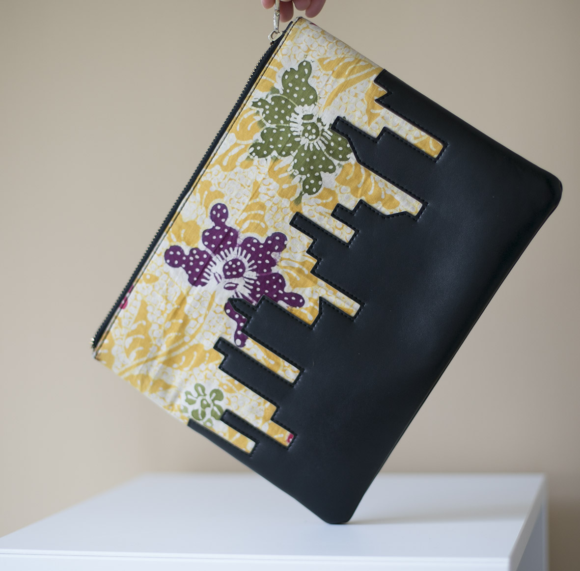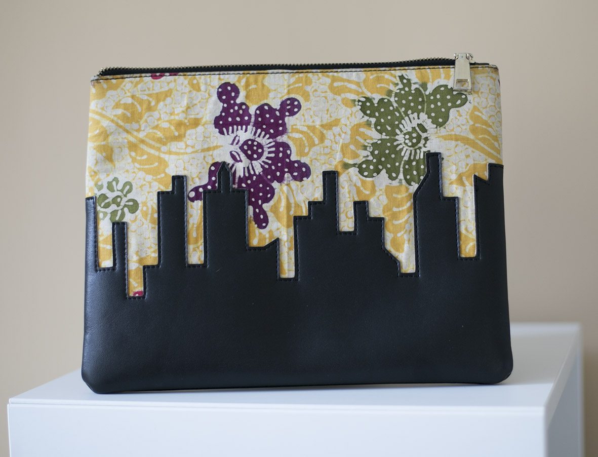 A backdrop of batik against black leather cut to resemble the city skyline. A unique batik clutch that will make heads turned!